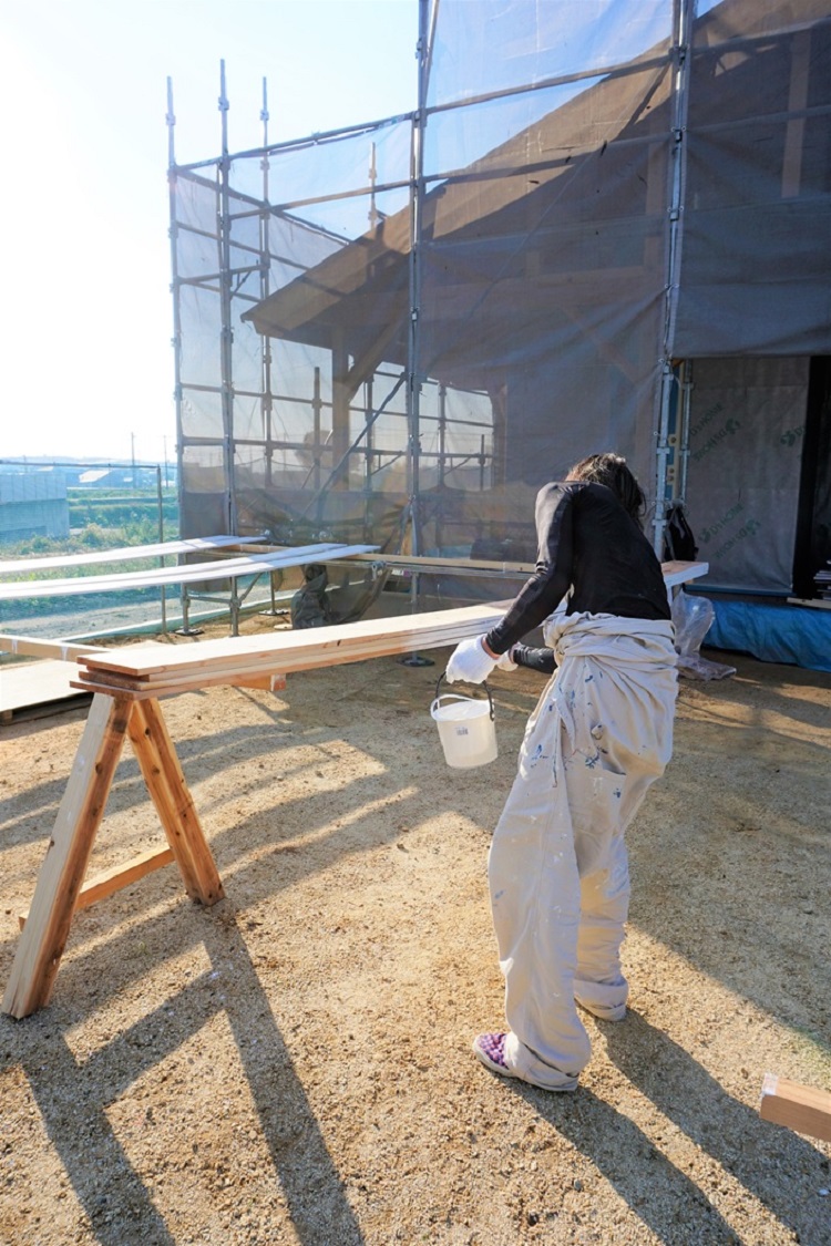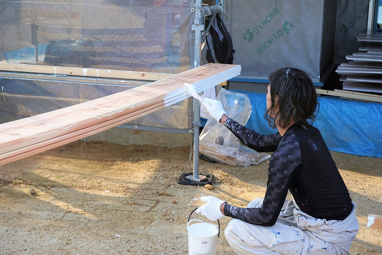 お施主様自らが外壁に貼る板にペンキを塗られていました!!