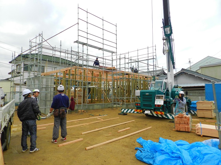 クレーンで柱を吊り上げたり