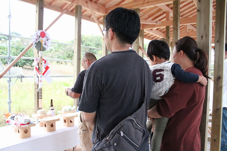お神酒で乾杯をした後四方に置いている餅を下に投げます