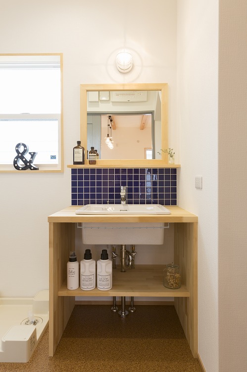 濃い青のタイルが印象的な造作洗面台。