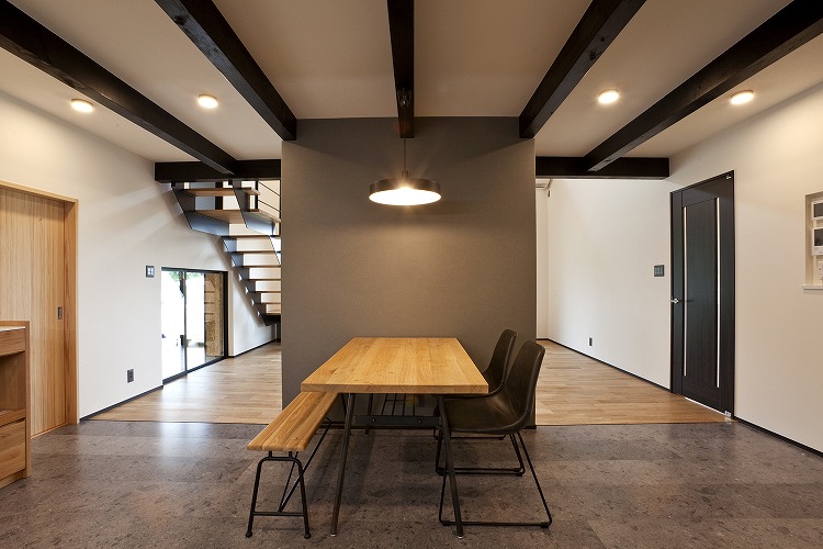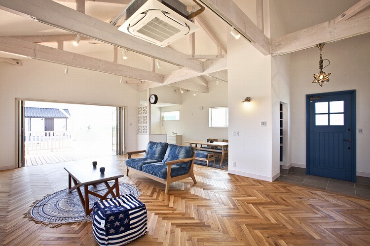 家具や玄関ドアのブルーが際立つように梁の色を白に塗装。