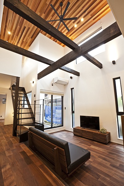 黒の構造梁と吹き抜け天井のレッドシダーが印象的なリビング。