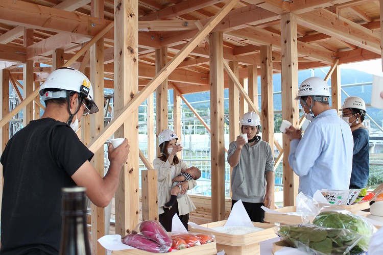 今後の工事の安全祈願と無事に上棟ができたことを祝してみんなで乾杯です。