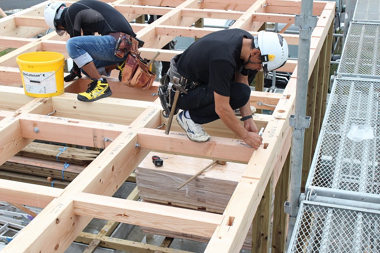 手前の方が棟梁のMさんです。柱と梁を組み合わせる作業の様子です。