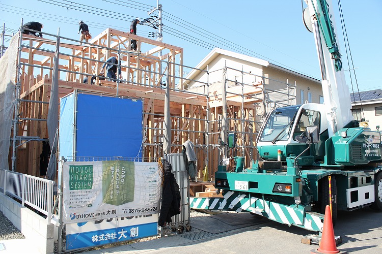 上棟は朝~夕方まで大工さんやレッカーさん8人ほどで一日で骨組みを組んでいきます。