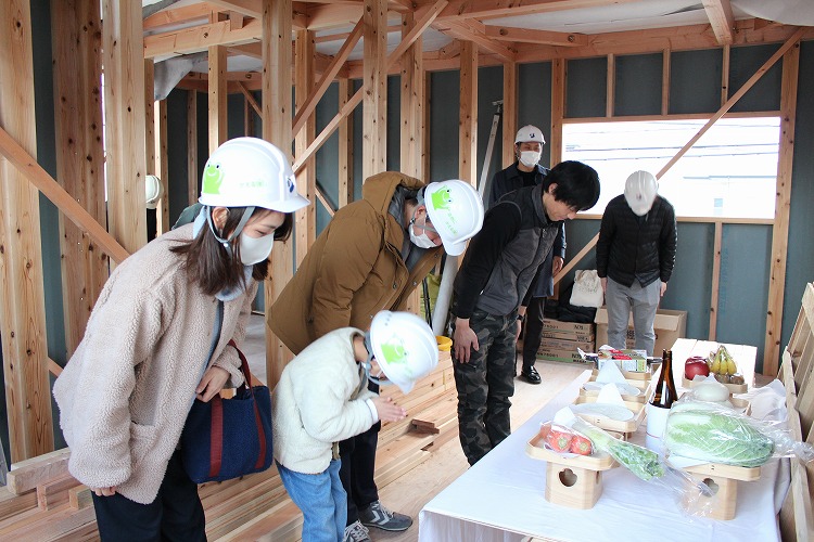 棟梁が祝詞を読み工事の安全とご家族の繁栄を祈願いたします。
