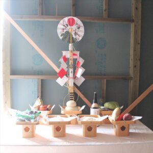 棟梁が祝詞を唱え、上棟をお祝いします。