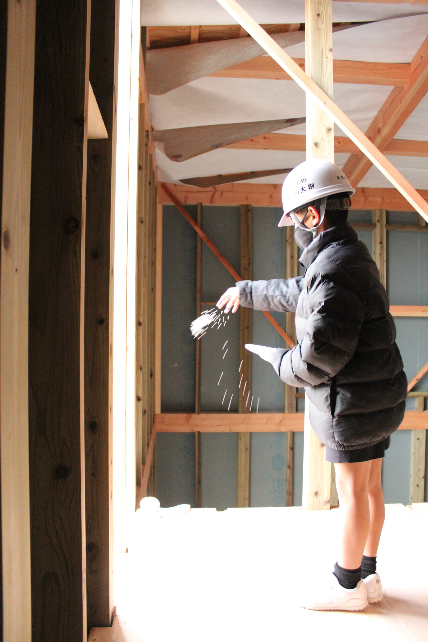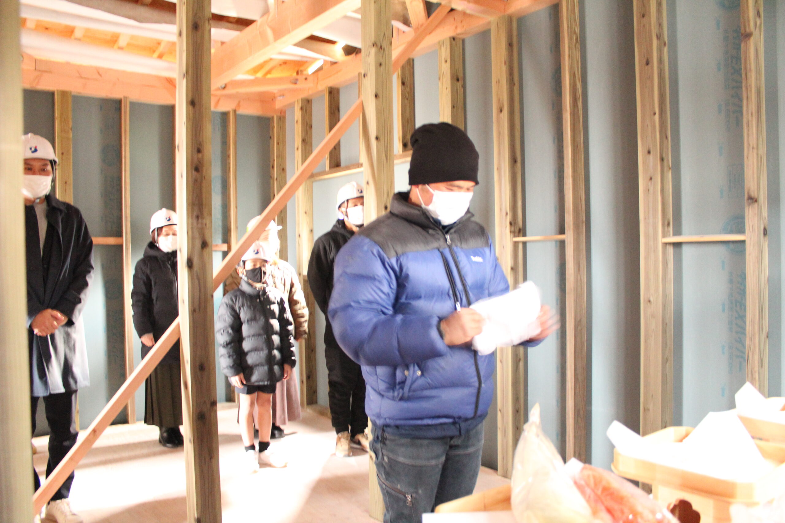棟梁、お施主様、お子様で四隅固めの儀を行います