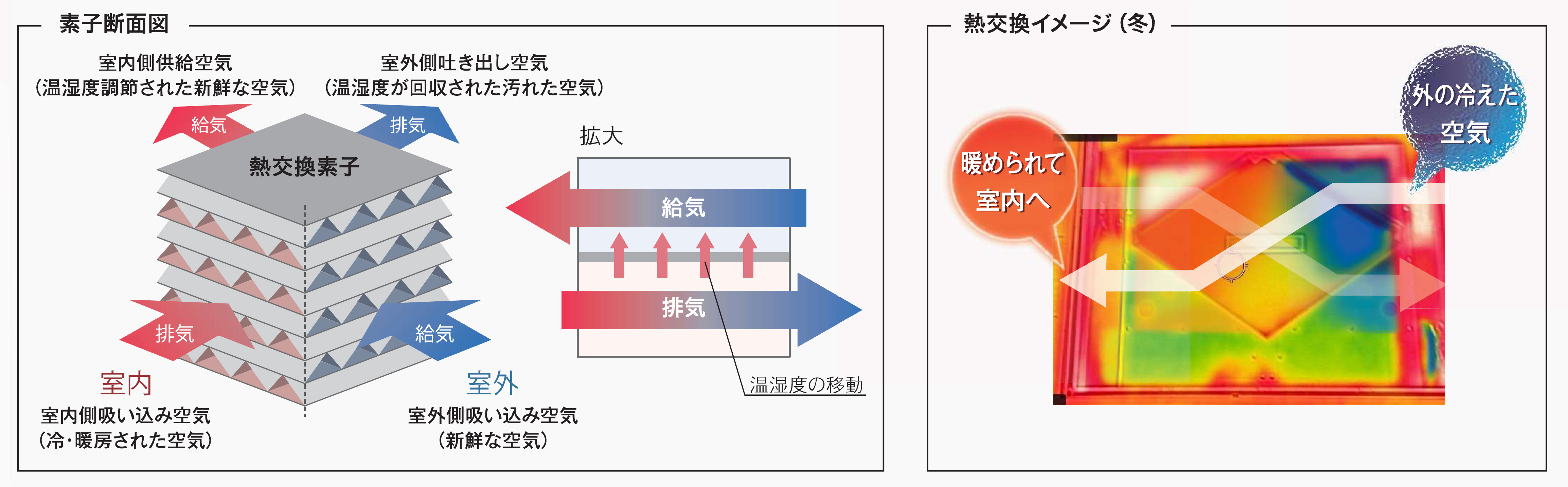 このような特別な装置「熱交換素子」を使って熱だけを取り込む仕組みになっています。