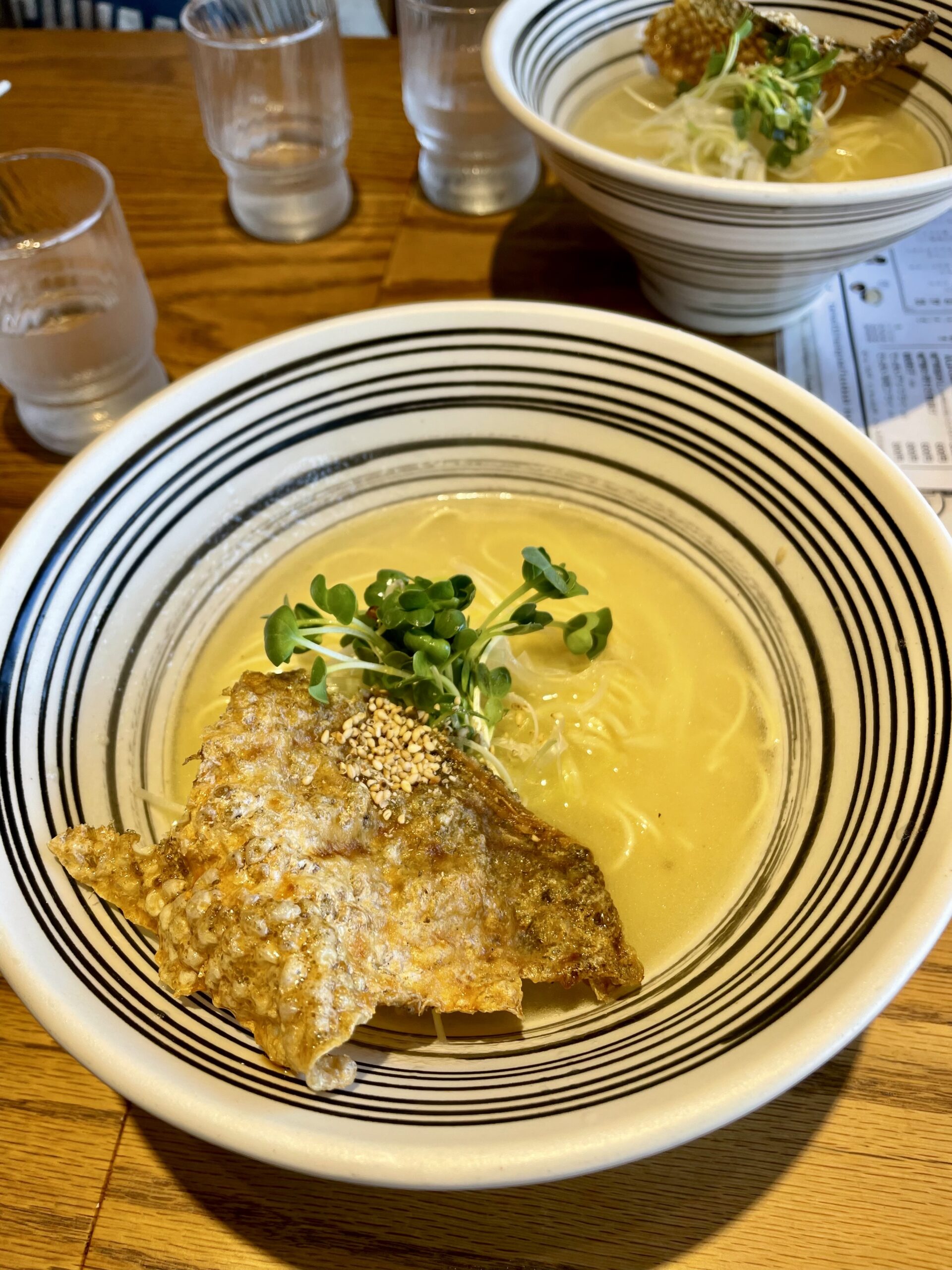 鯛の塩らぁ麺🍜とてもあっさりで上にのってるのが揚げた鯛の皮です!