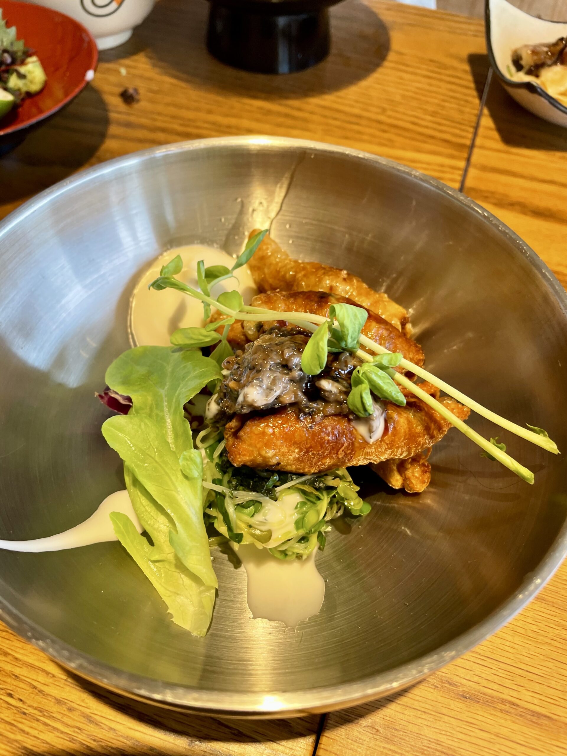 餃子は餡を鶏皮で包みもっちりとした食感でマヨ系ソースと甘い餡子?