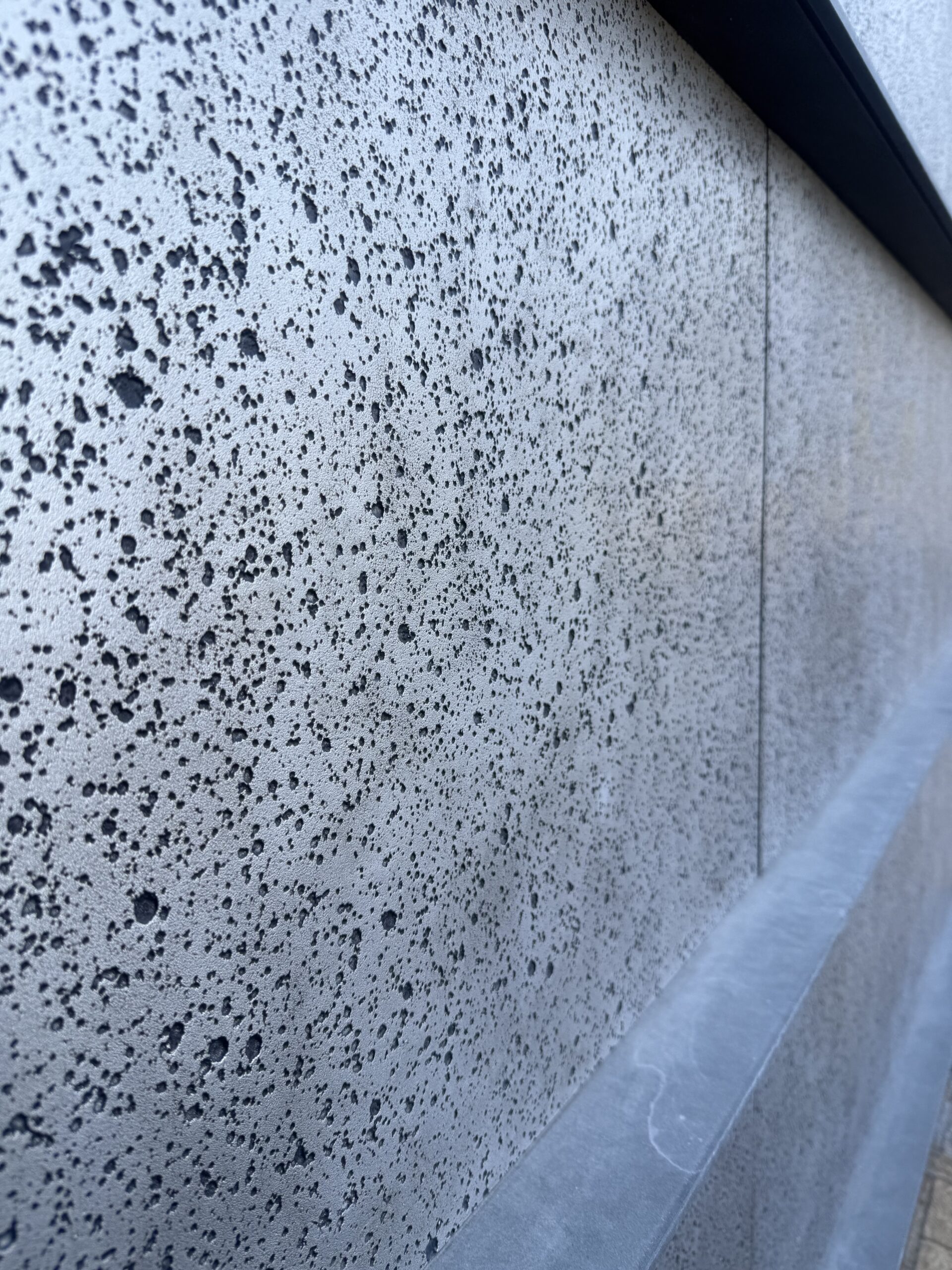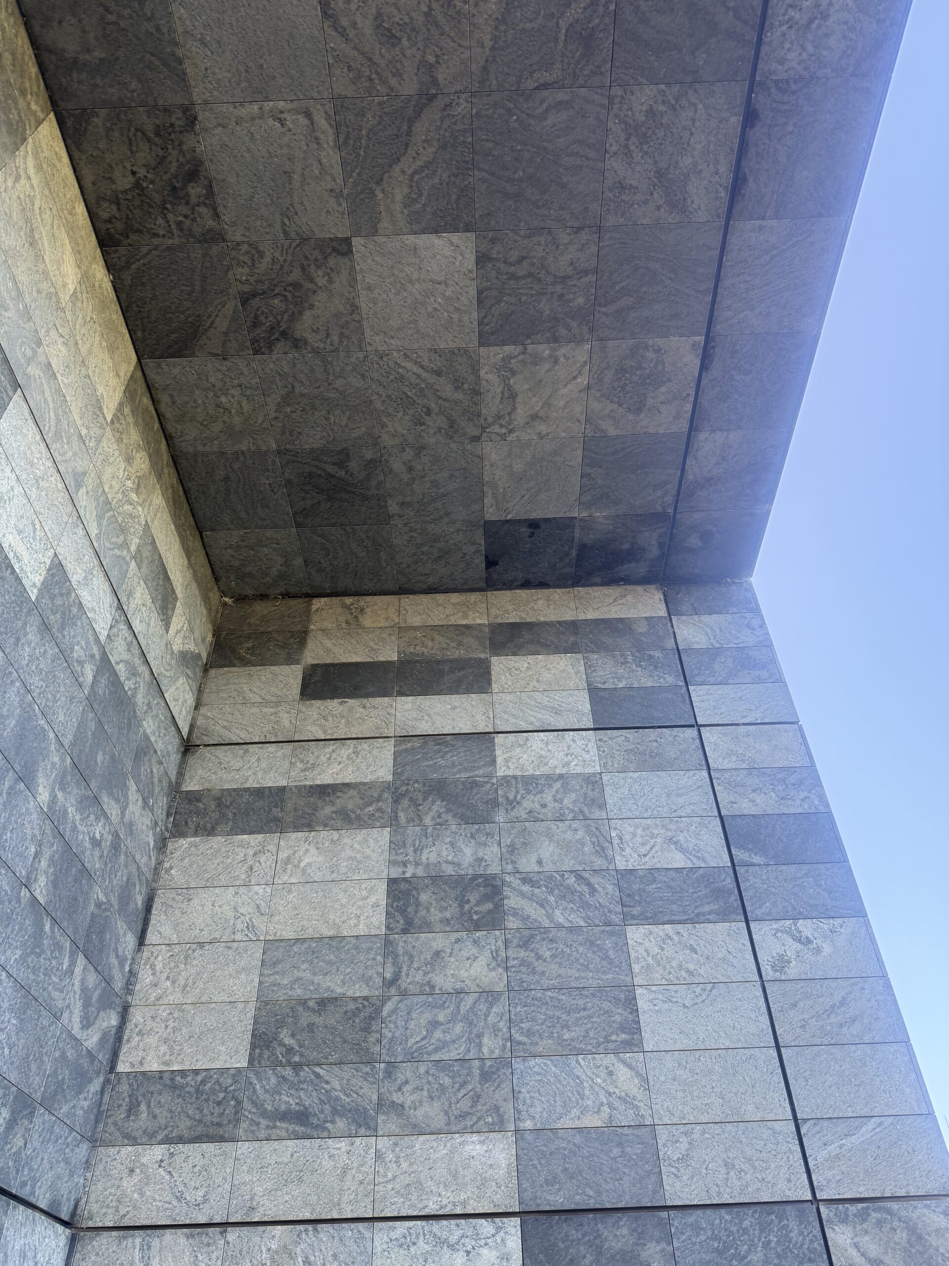 金属系パネルの流線と、御影石(または類似石材)による重厚な構成。