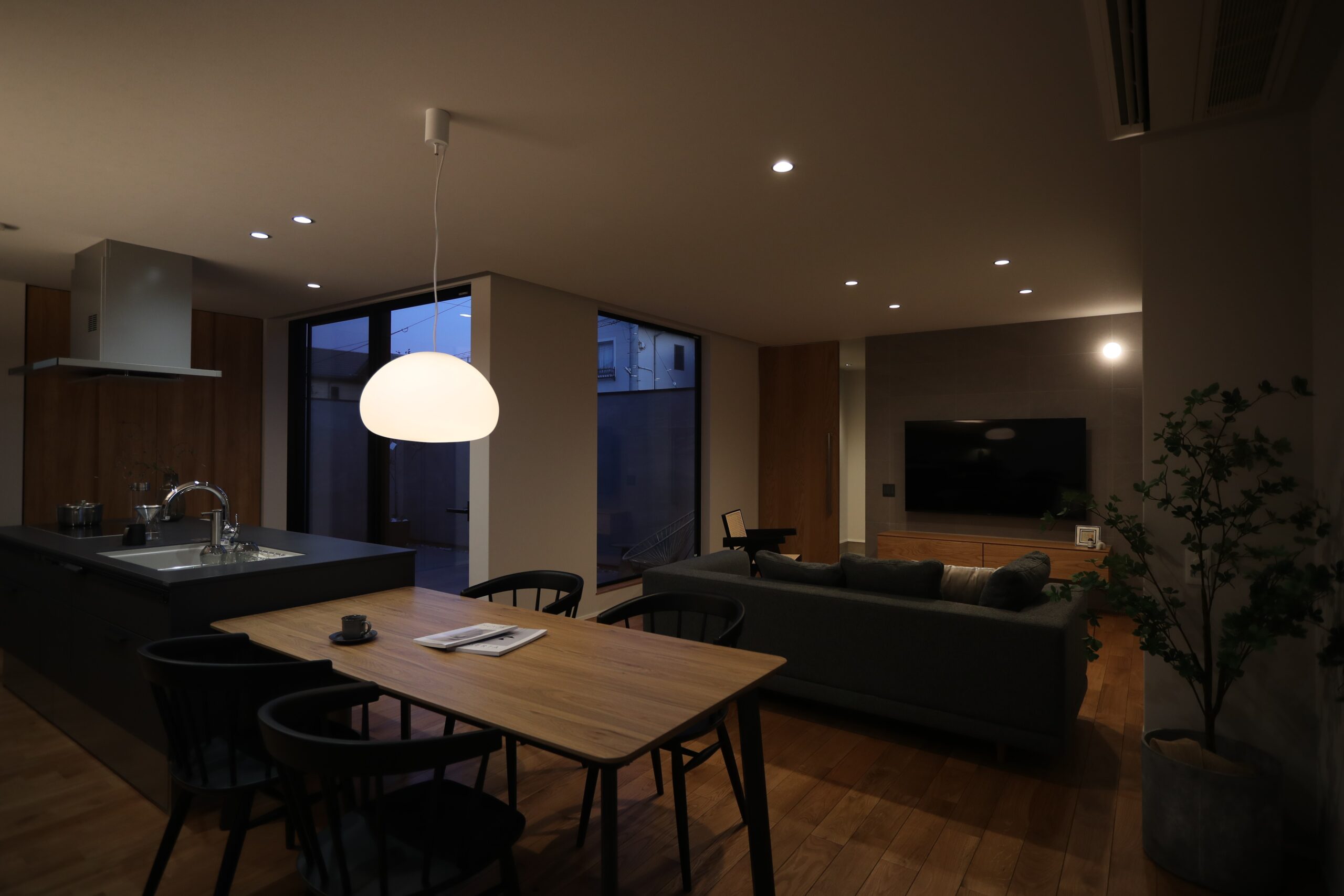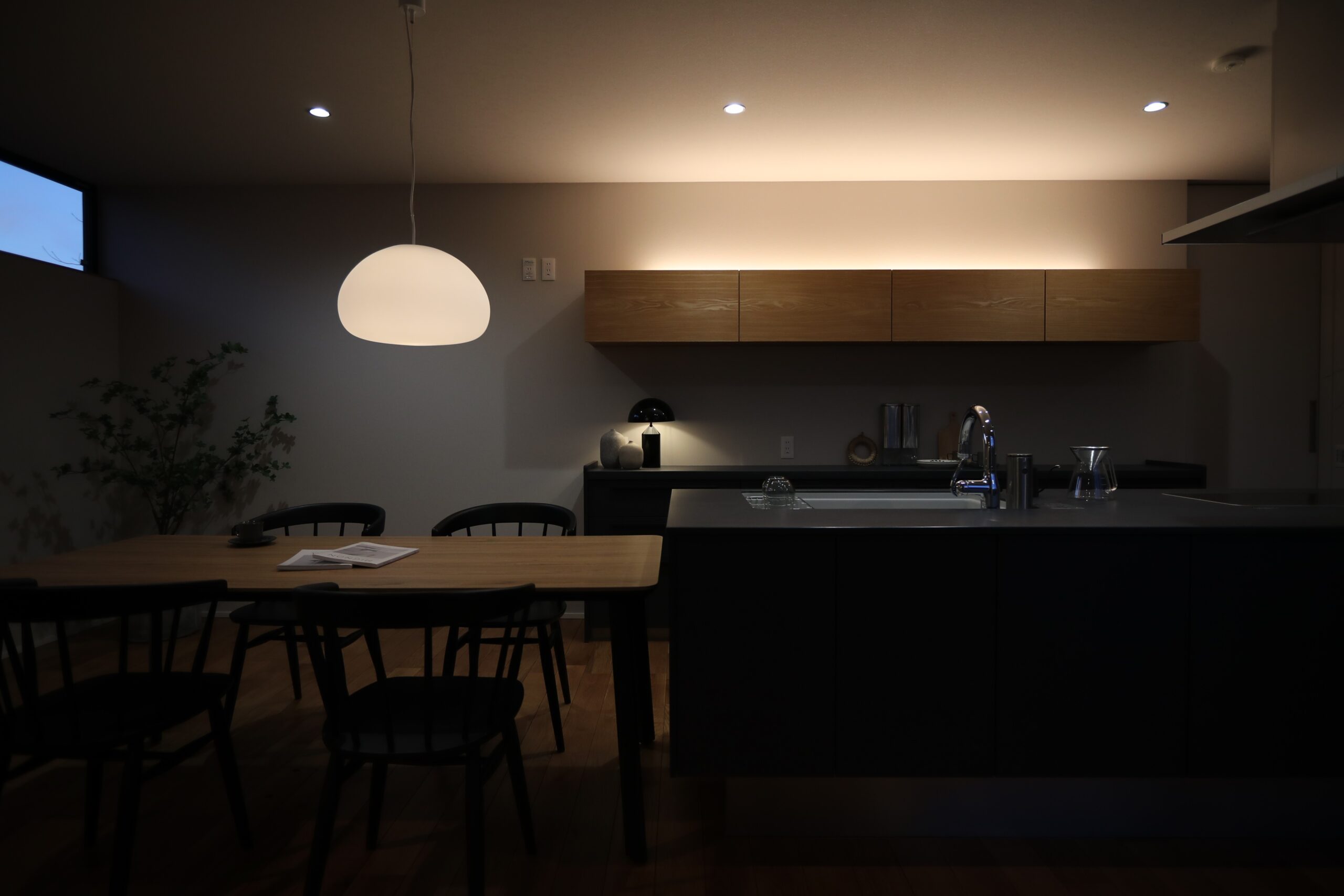 間接的なあかりと必要な明るさを重ね、夜にふさわしい落ち着きをつくります。